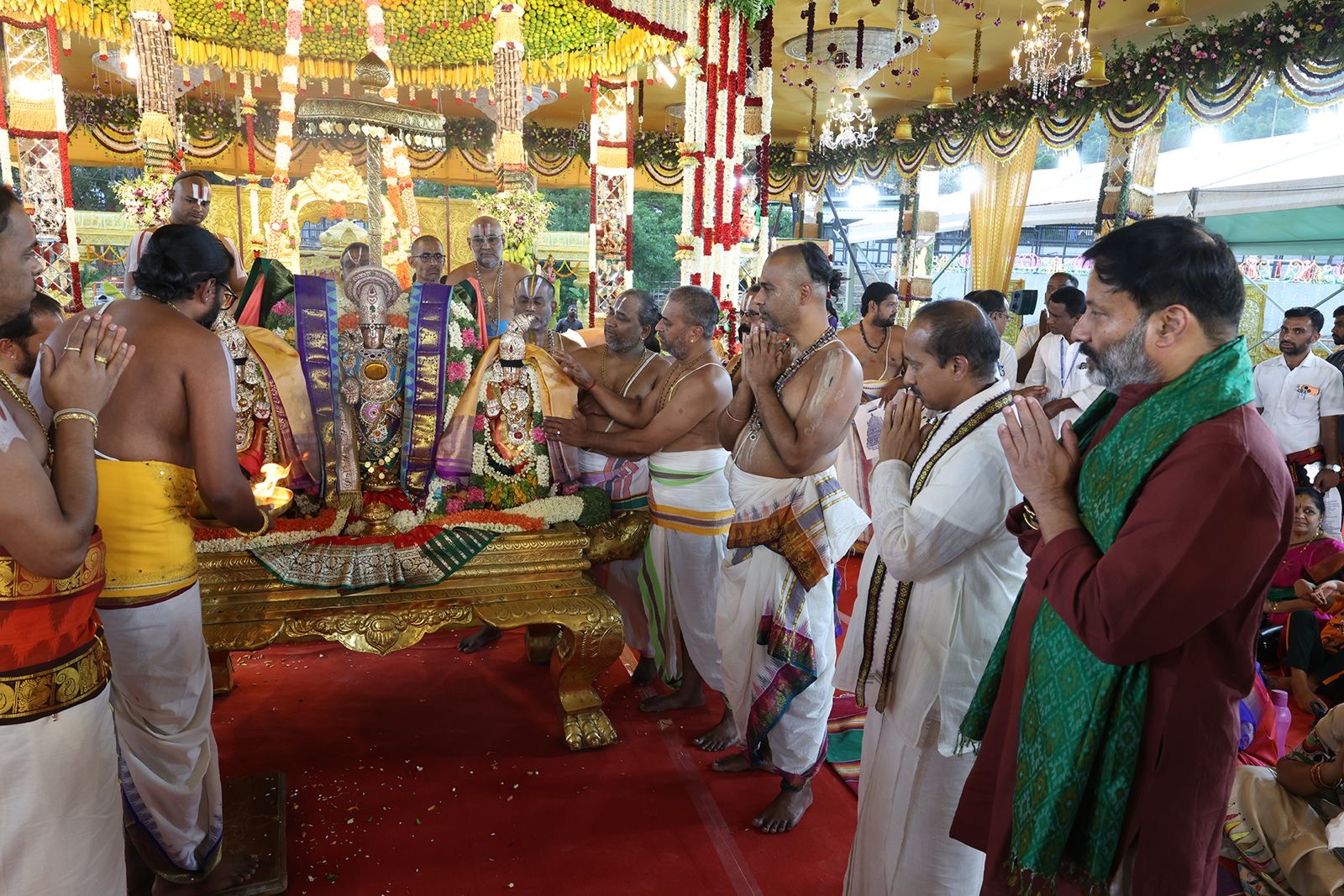 Alongside, His two consorts (Goddess Padmavati and the twin‑figure‑representation of Sridevi & Bhudevi) arrived at the Parinayotsavam Mandapam in separate palanquins, completing the triad‑formation around which the celestial‑wedding‑sequence is built. The Mandapam, decorated with traditional‑Vaishnava motifs and floral‑art, created a moon‑lit, shrine‑like‑atmosphere typical of this annual‑event.