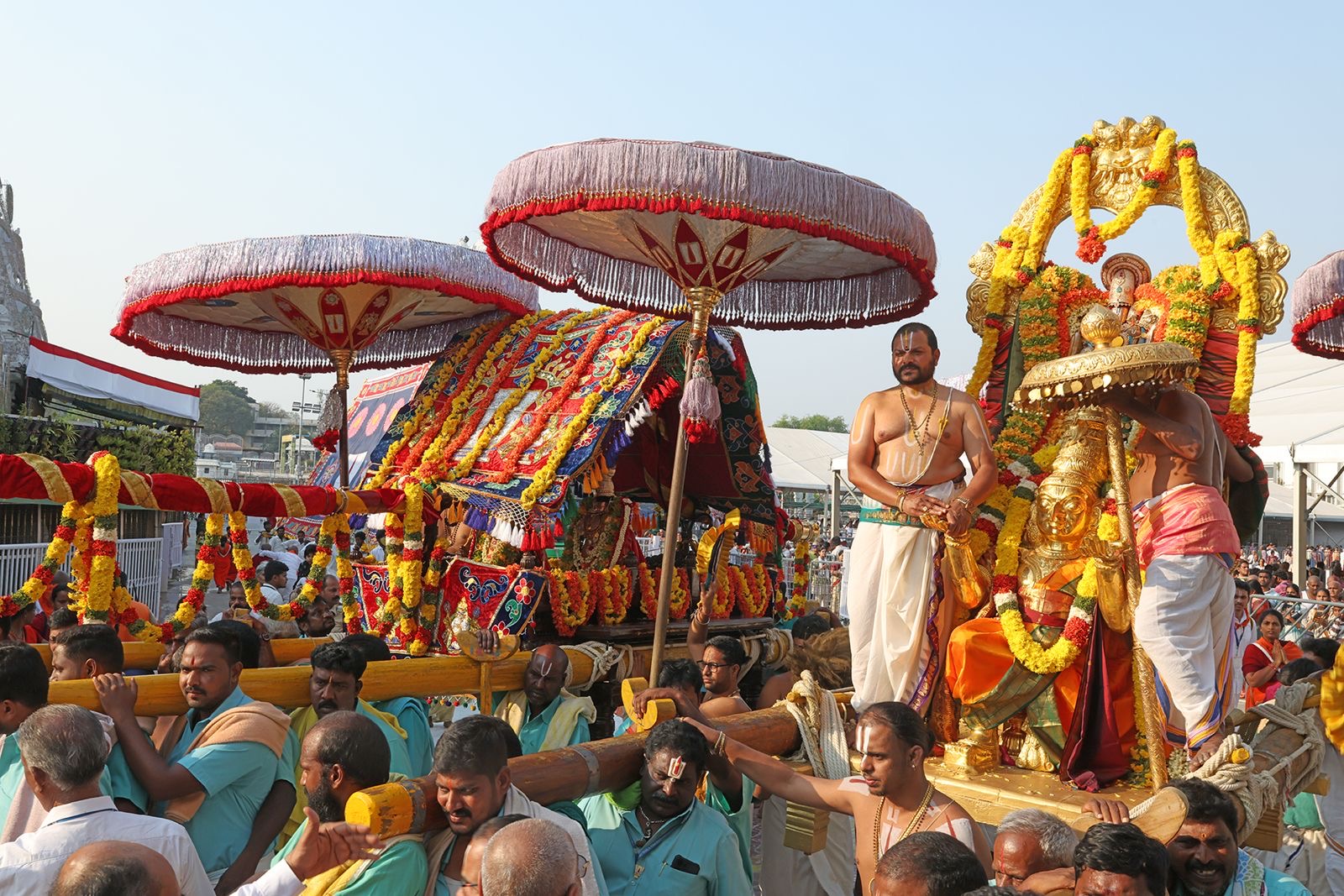 • very large number of devotees filled Narayanagiri Gardens and the return‑procession‑route, many having purchased special‑tickets or SSR‑tickets that allow closer‑view‑access to the swing‑seva and Vedic‑music segments.