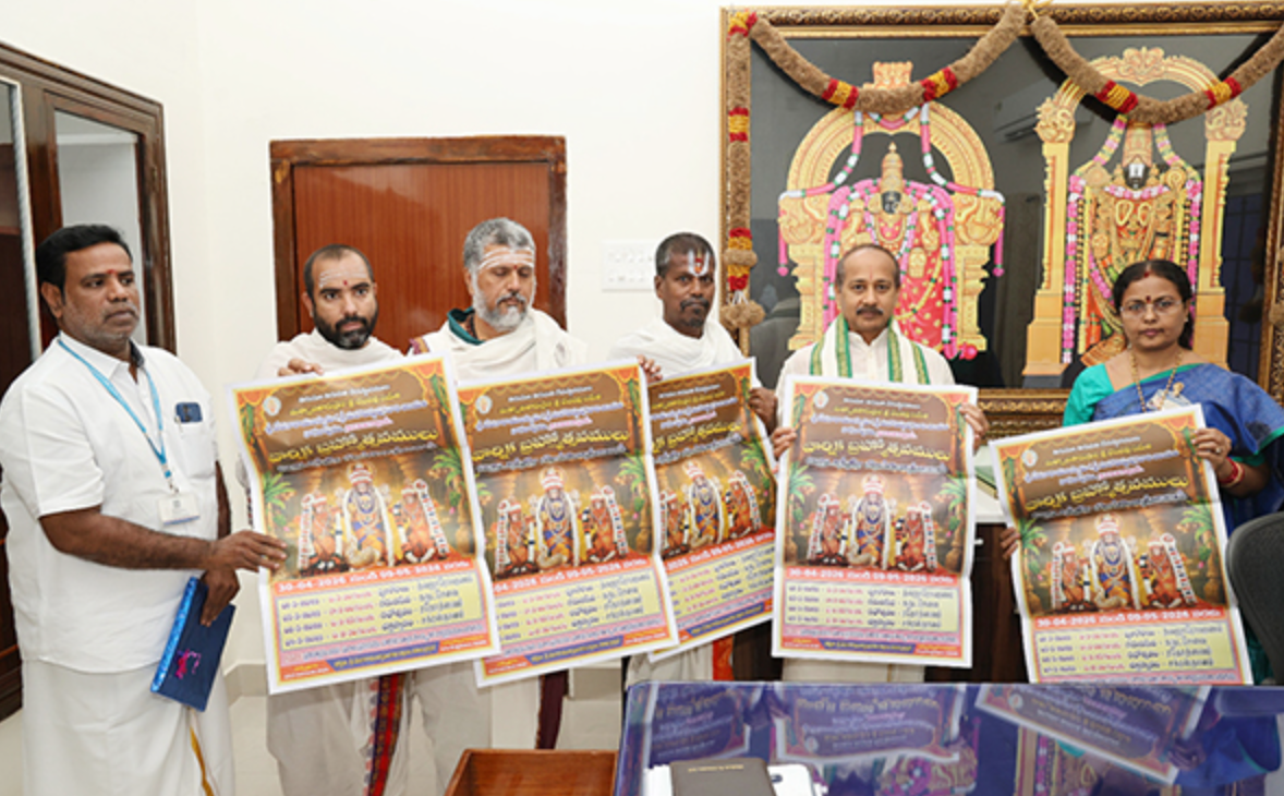Tirupati, 26 April 2026 – Tirumala Tirupati Devasthanams (TTD) Executive Officer Sri M. Ravichandra released the posters and booklet of the annual Sri Vedanarayana Swamy Brahmotsavams at the EO Camp Office in Tirupati on Sunday. The Brahmotsavams will be held from 1 to 9 May 2026 at Sri Vedanarayana Swamy Temple, Nagalapuram, about 70 km from Tirupati. The EO has directed officials to make elaborate, summer‑ready arrangements for devotees, including shelter‑canopies, drinking‑water‑points, first‑aid, and attractive‑decorations, and has invited devotees to participate in large numbers during the nine‑day‑festival.