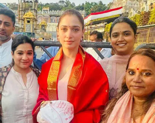 Tirumala, 19 April 2026 – Actor Tamannaah Bhatia visited the Tirumala temple on Sunday to seek the blessings of Lord Venkateswara and shared glimpses of the visit on her Instagram Stories. In the photos, she was seen outside the temple with fellow devotees, dressed in a simple pink ethnic outfit with a red dupatta, after also posting a short video from the car on her way to the shrine.