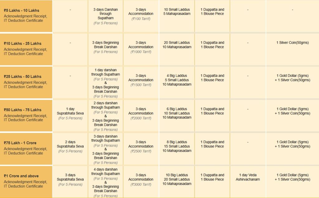 Tirumala Tirupati Devasthanams (TTD) offers special darshan, accommodation, and prasadam privileges to devotees who donate substantial amounts to its various trusts and schemes. Donors from ₹1 lakh up to and beyond ₹1 crore receive lifetime‑annual benefits, including Supadham, Break, and Suprabhata seva along with free or subsidized accommodation and valuable gifts such as gold‑dollar and silver‑coin tokens.